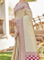 Adorn yourself in the epitome of elegance with this resplendent yellow saree exquisitely crafted to captivate hearts and turn heads. Crafted from luxurious art silk its vibrant yellow hue evokes a sense of joy and radiance perfect for any celebratory occasion. The saree is adorned with intricate Benarasi zari and jacquard work showcasing a harmonious blend of traditional craftsmanship and contemporary allure. The golden motifs delicately woven into the fabric add a touch of regal splendor elevating its allure to new heights. Contrasting the sunny yellow backdrop delicate pink accents grace the saree creating a captivating visual contrast that accentuates its beauty. The subtle yet striking floral and motif work in pink further enhances its charm adding depth and dimension to the ensemble. Completing the ensemble is a meticulously tailored blouse in matching pink customdesigned to complement the saree flawlessly. Embellished with coordinating floral and motif work the blouse adds a touch of sophistication and completes the look with finesse. Indulge in timeless elegance and exquisite craftsmanship with this breathtaking ensemble a true testament to the timeless allure of Indian traditional attire. Whether its a wedding festival or any special occasion this ensemble is sure to make you the epitome of grace and style.