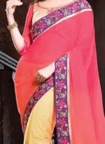Yellowish cream and coral pink shaded faux chiffon half and half saree looks dainty with resham embroidered floral and leaf patterned border framing both halves. Comes with matching blouse.