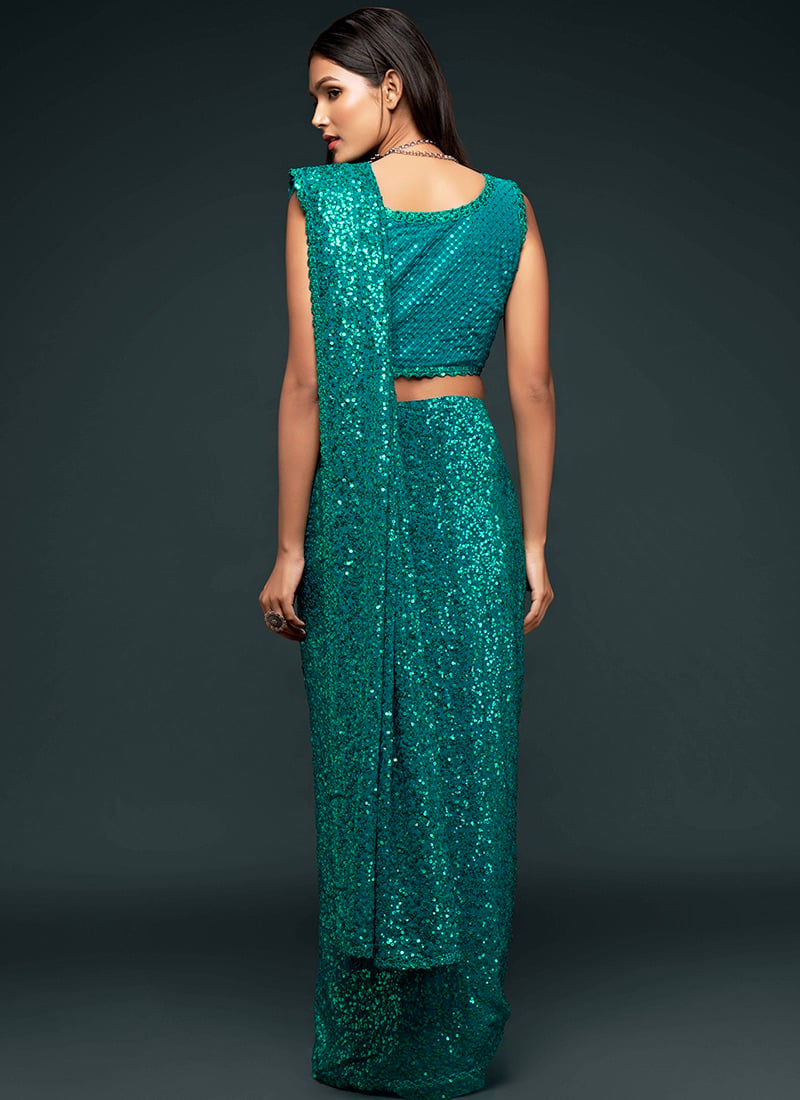 Make the heads turn whenever you dress up in this dark green color georgette saree. This saree is displaying some wonderful work done with embroidered and sequins work look chic. This saree comes with unstiched dark green color georgette blouse.