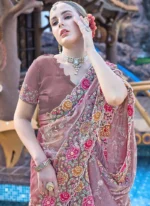 Floral Embroidered Sequins Stone Embossed Saree Festive Wear