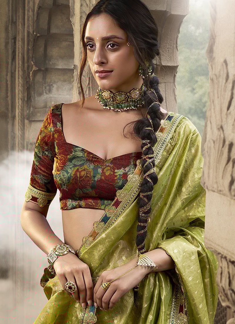 - This pista green tissue saree is crafted with fine jacquard weaving enriched with traditional zari work. The fabric has a soft sheen that reflects light beautifully while maintaining a lightweight drape for all day comfort. The embroidered sequins along the border add a touch of shimmer and elegance making the saree perfect for festive occasions. The lace edging frames the saree neatly accentuating its refined detailing. This harmonious blend of pista green and olive green tones makes it a refreshing choice for both daytime and evening celebrations.