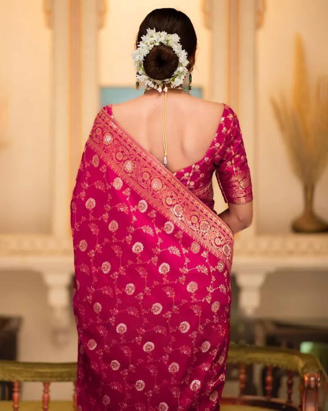 - The last image gives a detailed look of the blouse piece that comes with this saree (The model is wearing a blouse from our in-house wardrobe)